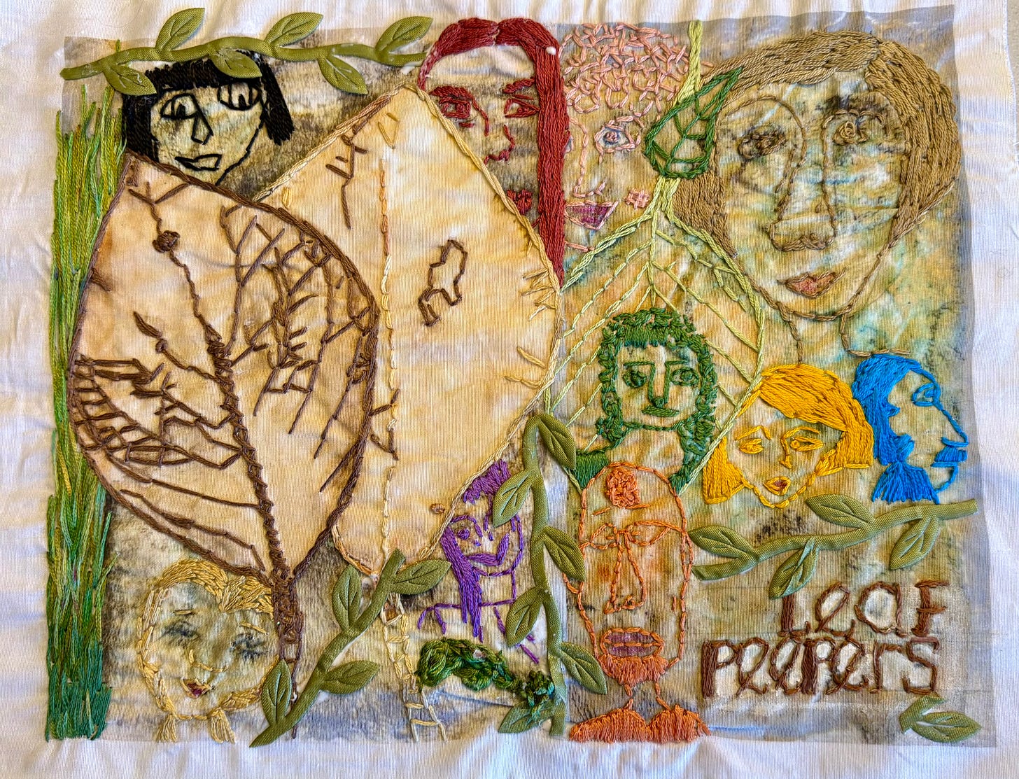 Here’s a little work I did during the holidays, “Leaf Peepers.” The leaves were found in my yard and eco-dyed on paper, then the image was copied onto very thin cloth. Next I stitched little faces I “found” in the design, a process called intuitive stitching. This has ended up being a test piece for a bigger piece I might do later on. What I learned: the face done in black stitching looks best, I should use a smaller needle and two strands of floss instead of three, I should use heavier background material, and I should definitely use a hoop. Experienced stitchers will be able to tell exactly where I used a hoop and where I didn’t.